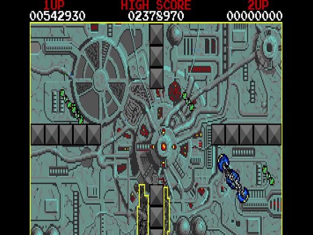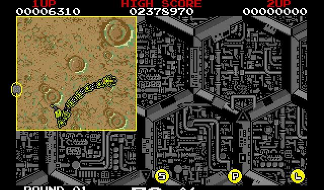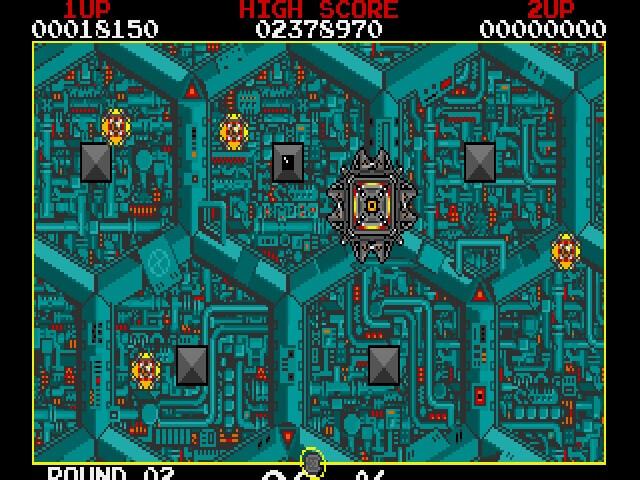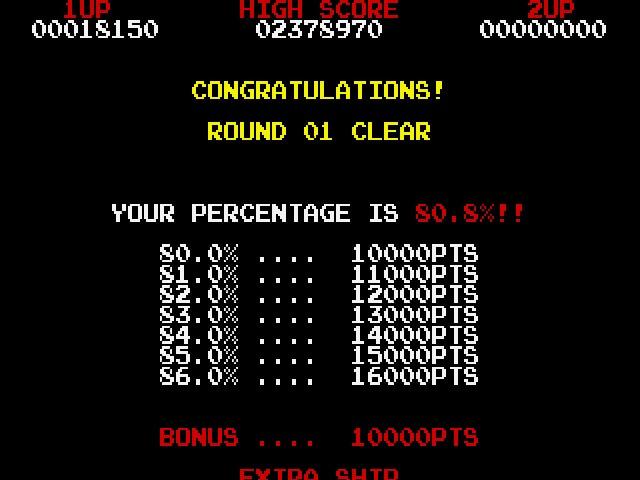 The overall gameplay is the same as in Qix. The main enemy, however, is no longer a collection of lines; instead, it varies between levels and is always accompanied by smaller enemies. When the player’s spaceship successfully claims a section of the level, the side where the main enemy is located is referred to as “the outside.” Any smaller enemies who end up on “the inside” are killed, earning you points. To complete a level, the player must claim at least 80% of the level’s area. Previously, the limits were set at 75% in Qix and 70% in Super Qix. Volfied’s levels each have their own background and enemies. The cleared area graphic is replaced with the graphic of the next level as the player claims areas of the level. Grey boxes appear on the field as well, and when collected, they grant the player a random power-up. Power-ups can provide the player with extra speed or even weapons. On certain levels, there is a special completion bonus that can be obtained by shooting the main enemy.